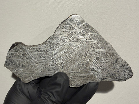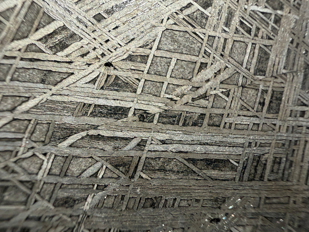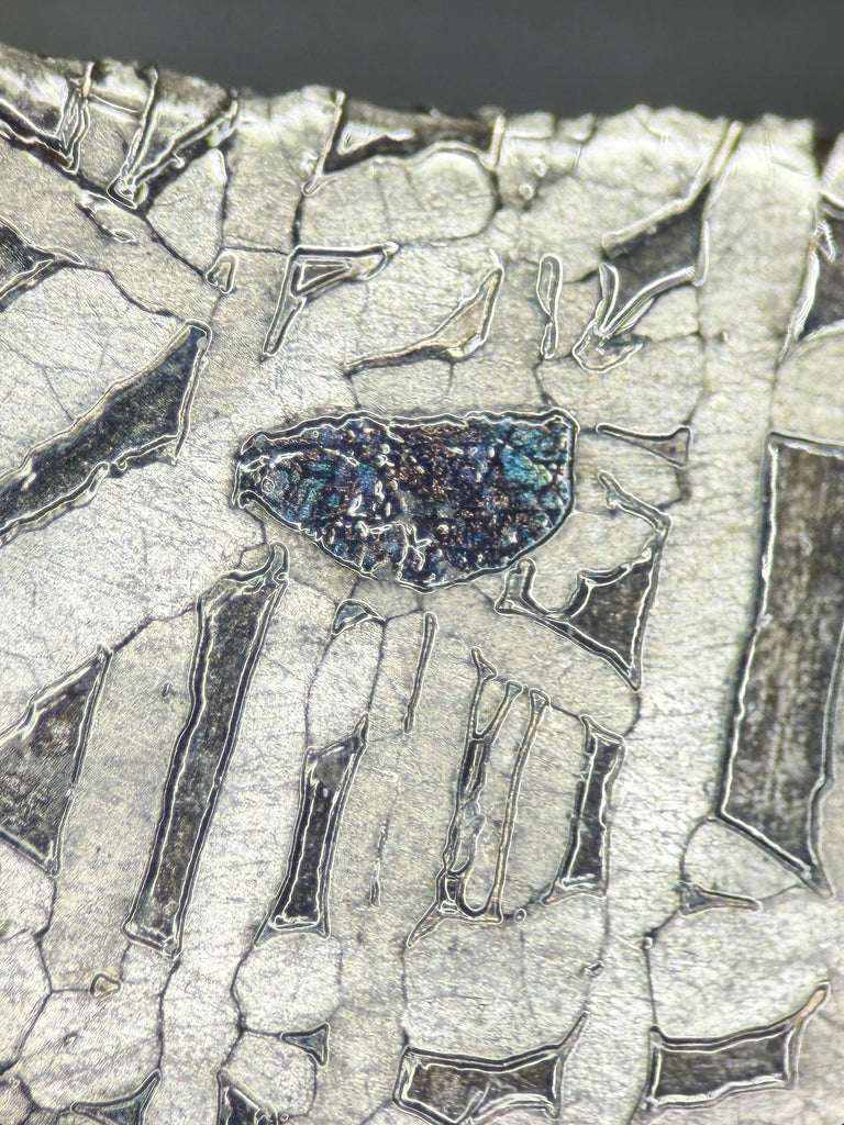 NEA 092 is an absolutely gorgeous iron found in 2023. The Widmanstätten patterns on this one are phenomenal. Under the microscope one of the crystals exhibits a bluish iridescent glow.