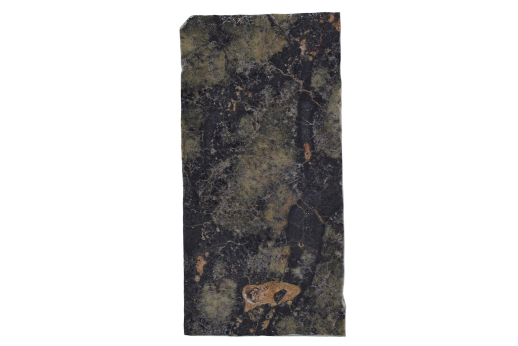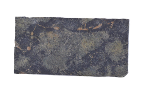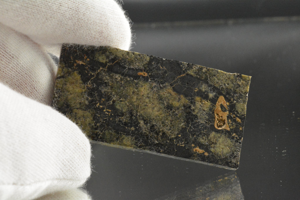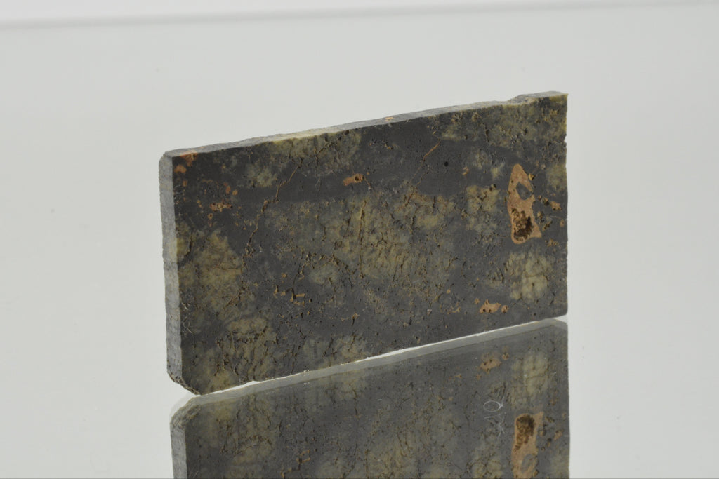 NWA 10961 is a Martian Shergottite, this specimen is cut into a rectangle showcasing its pale green fresh interior.