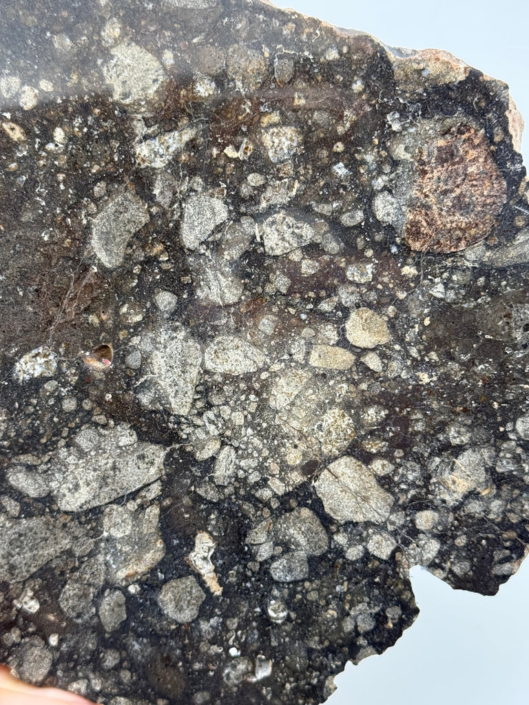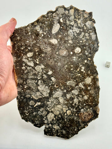 One of the most beautiful eucrite melts ever found, this massive slice is a freeze-frame from a near fatal collision between two asteroids that nearly destroyed asteroid 4 Vesta. The impact released enough energy to flash melt chunks of the two bodies together creating a beautiful breccia that has survived in space, unchanged, for 4.5 billion years.