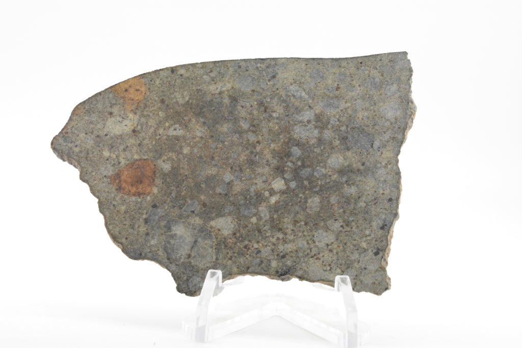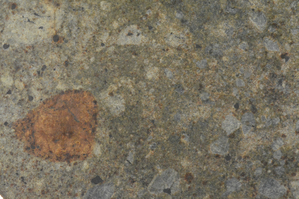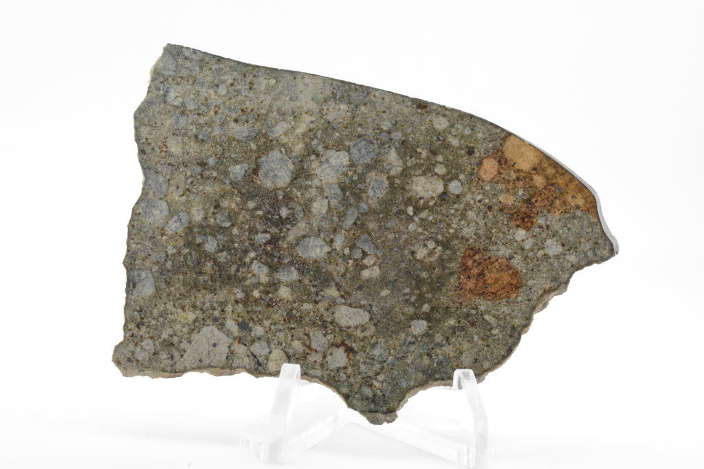 NWA 15953 is a Diogenite found in 2022 in Algeria. This species is composed of larger angular grains, and has a large section with amazing fusion crust. A beautiful stone!