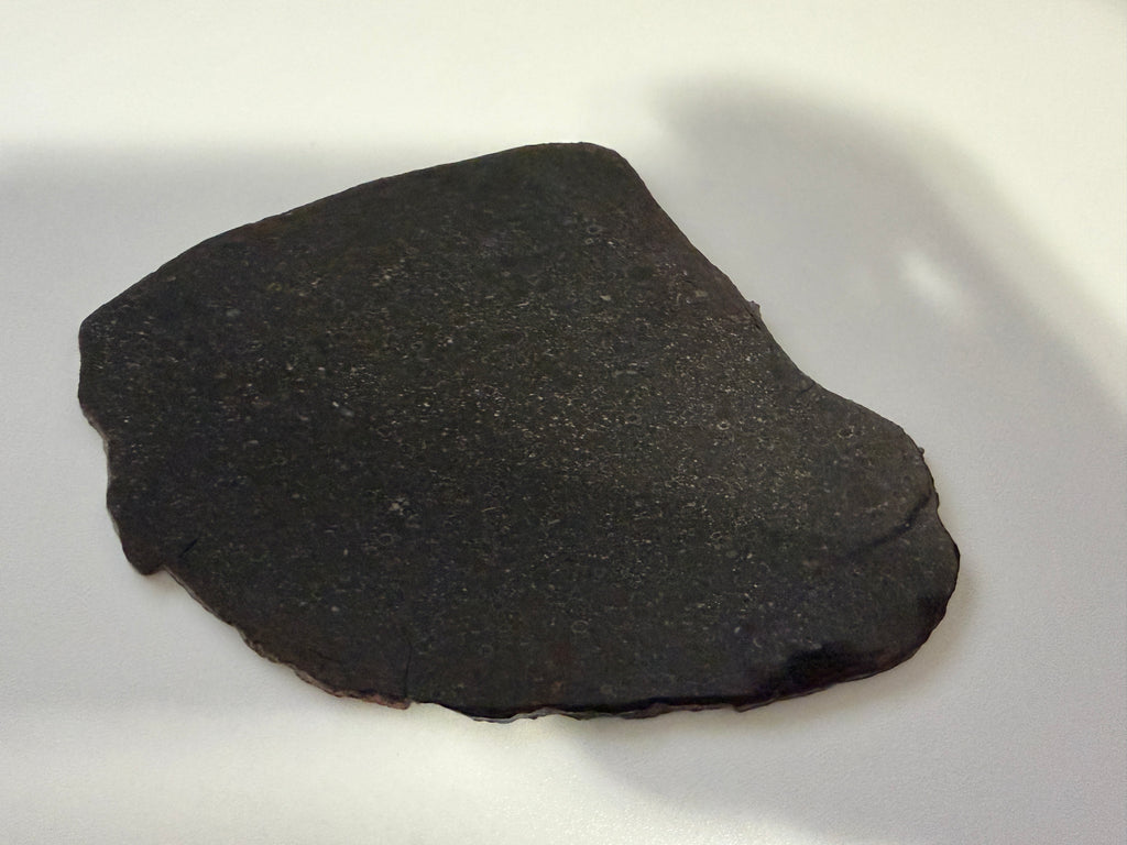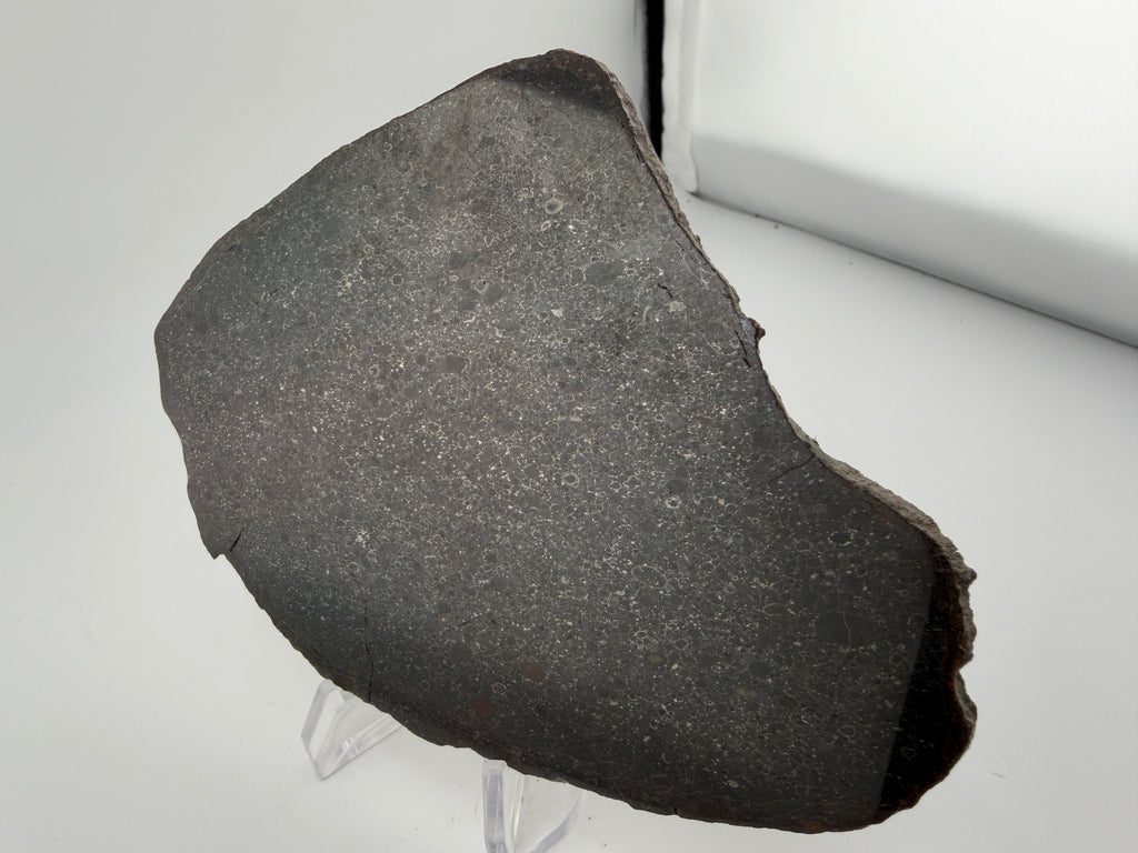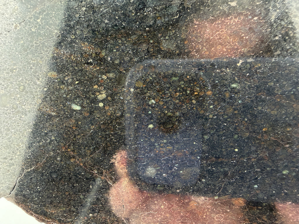NWA 15825 was found in 2022, this Chondrite is packed full of well-defined chondrules, some a beautiful opaque greenish color. The mirror finish is so smooth and shinny it honestly made it hard to photograph.