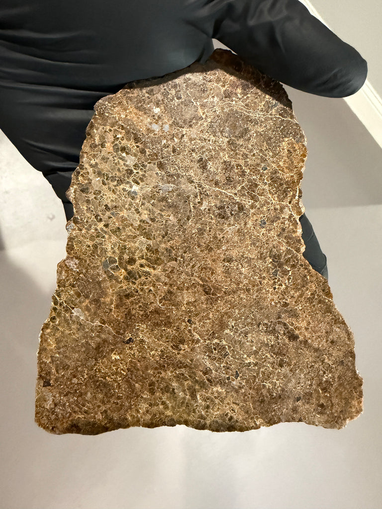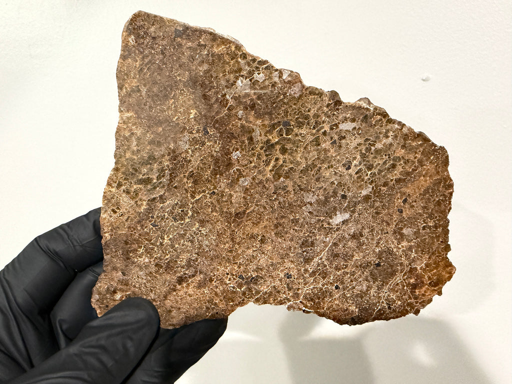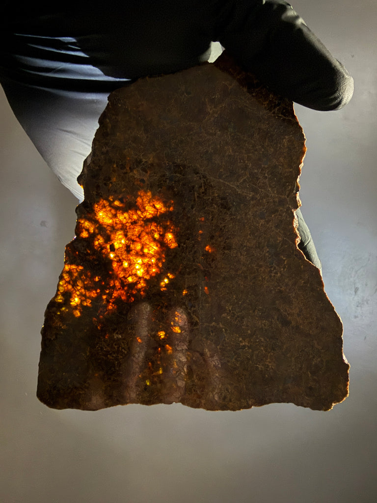 NWA 16317 is an extremely beautiful meteorite, its translucent green orthopyroxene crystals glow a wonderful orange hue when lights is passed through it. NWA 16317 is a Diogenite and is likely originated from astroid Vesta.