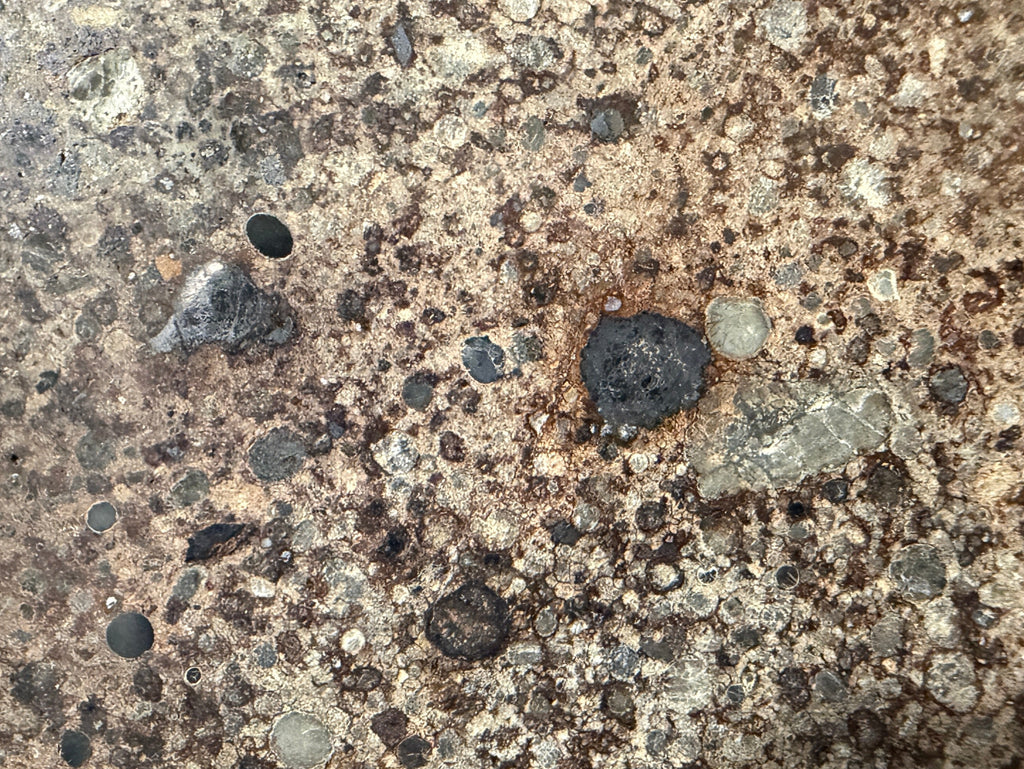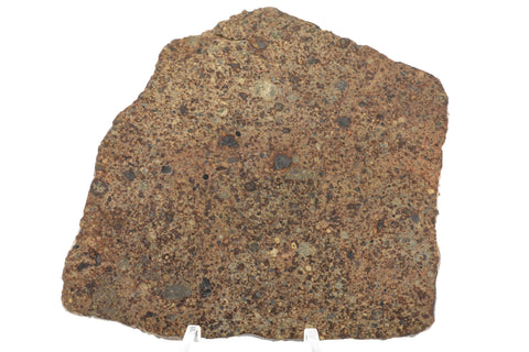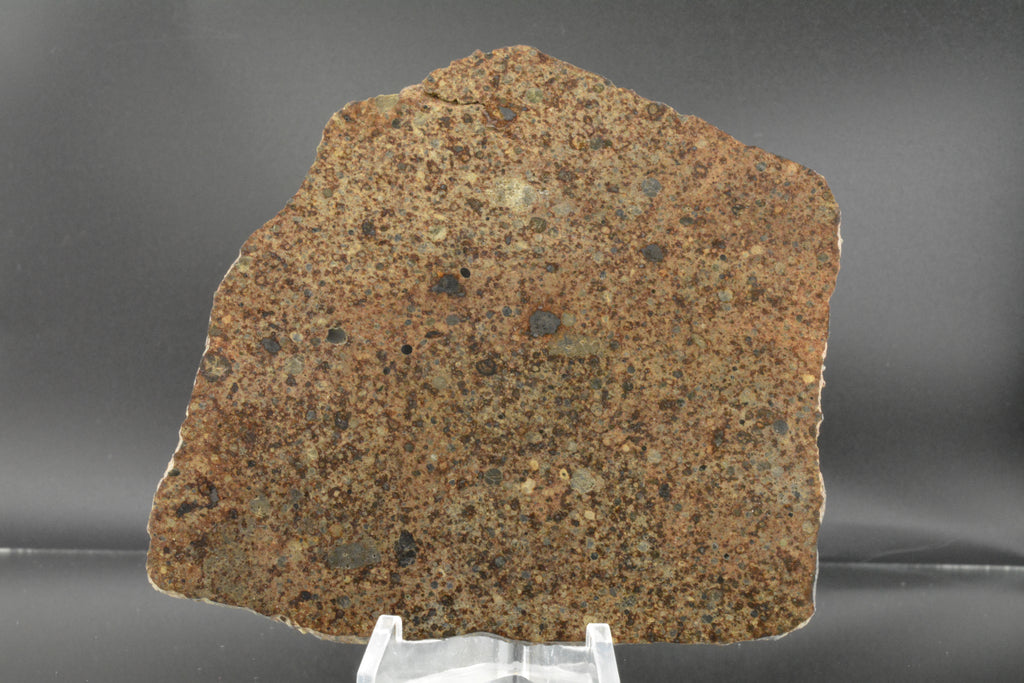 Here we have a relatively fresh chondrite with areas of fusion crust remaining. Chondrules are covering the entire slice and it reveals large, sporadic metal/sulfide grains.